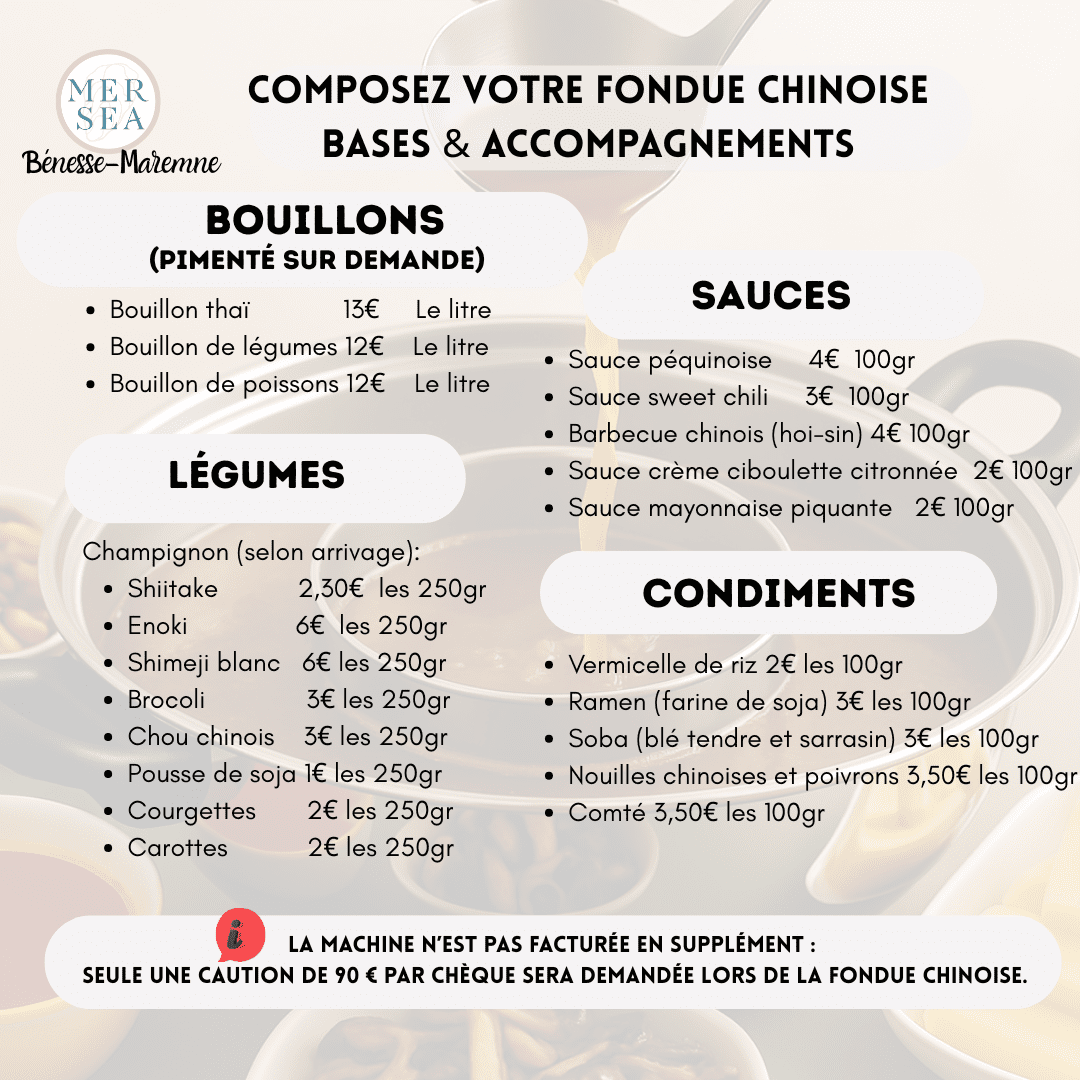Fondue chinoise à Bénesse-Maremne : produits frais, bouillons maison et sur-mesure chez MERSEA